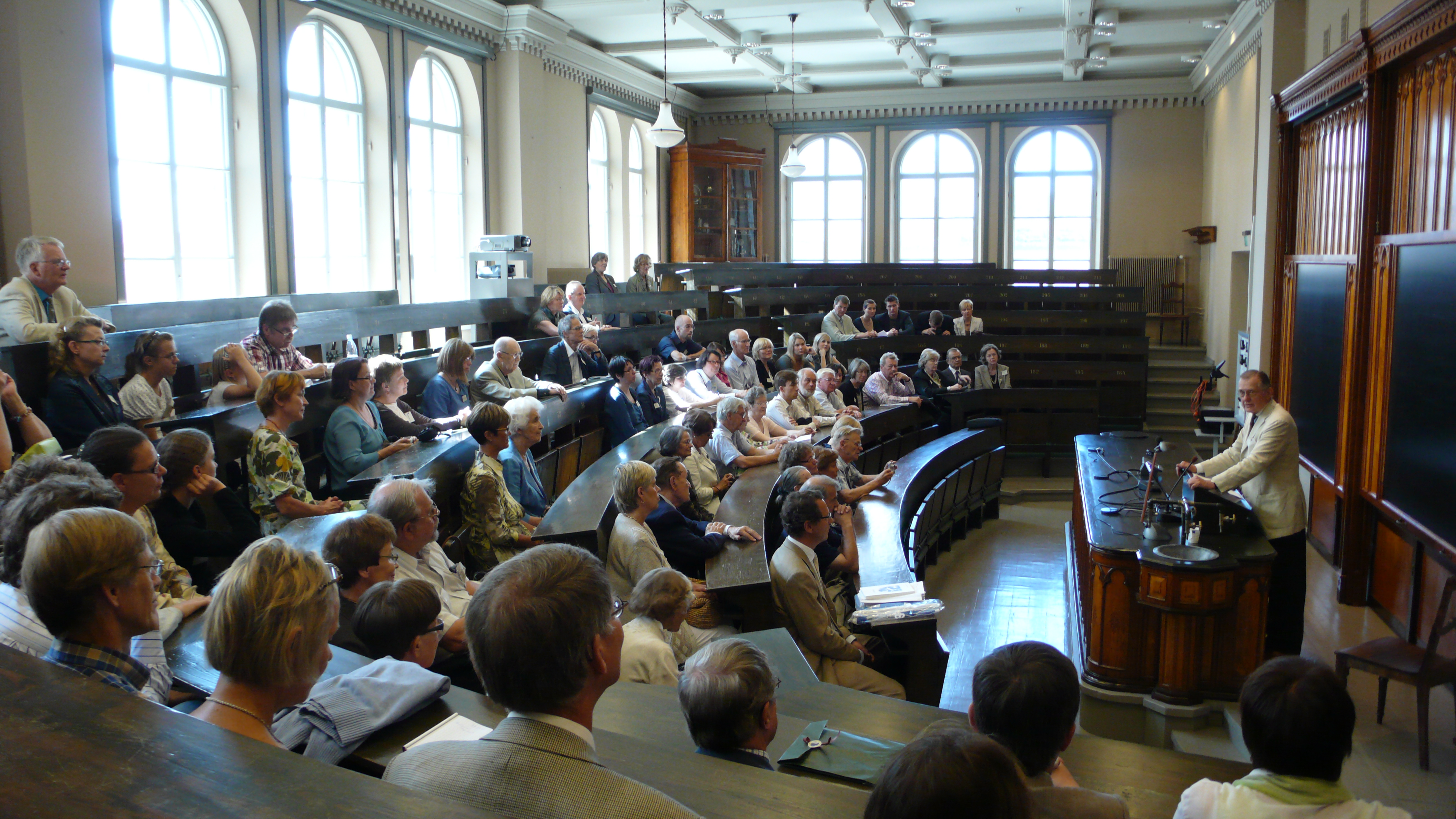 Yliopiston vanha kemian laitoksen luentosali tarjosi oivat puitteet professori Matti Klingen esitelmään "Akateemiset Lagukset".