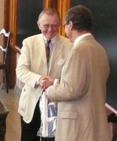 Sukuseuran puheenjohtaja Eero Hirvensalo luovutti professori Matti Klingelle sukuseuran viirin.